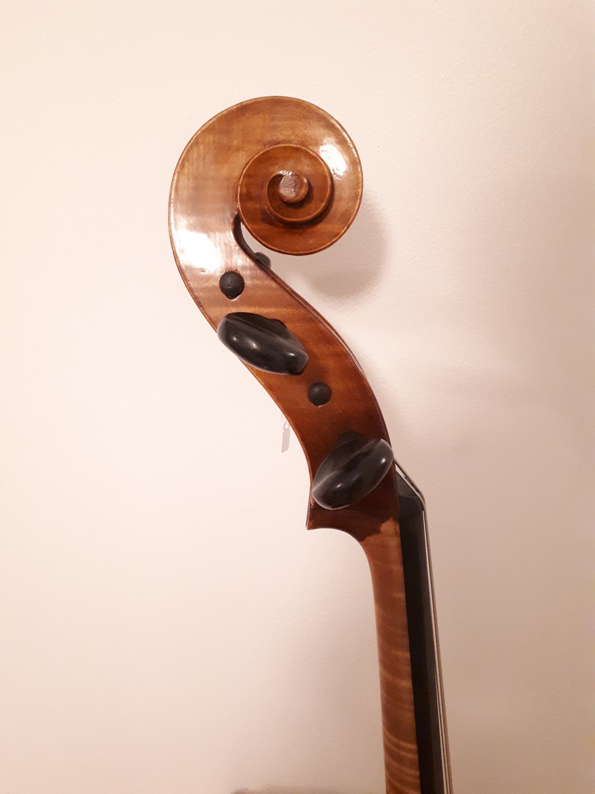 Ytterligare info: En kanoncello med styrka i klangen tillverkad under 1900-talets mitt. Byggaren är okänd men den är av mycket hög kvalité som de mest välgjorda instrumenten från denna tid i Tjeckoslovakien och skall inte förväxlas med enklare instrument med liknande etiketter. Uppställning med Romberggreppbräda och stall signerat Götz.